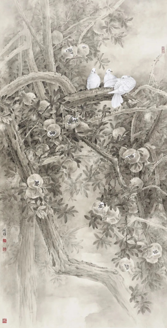 在花鸟画领域,周同祥的作品充满了生命力和感染力。他笔下的石榴树,不仅笔墨鲜活生动,构图也别具匠心,色彩灿烂而富有力量,仿佛每一片叶子、每一颗果实都蕴含着勃勃生机。这种生命力的表达,正是周同祥对自然、对生命的敬畏与热爱的体现。同时,他的花鸟画作品还蕴含着深刻的寓意和象征意义,如石榴树常被视为多子多福的象征,周同祥通过这一题材的选择和表现,传达出他对美好生活的向往和追求。
